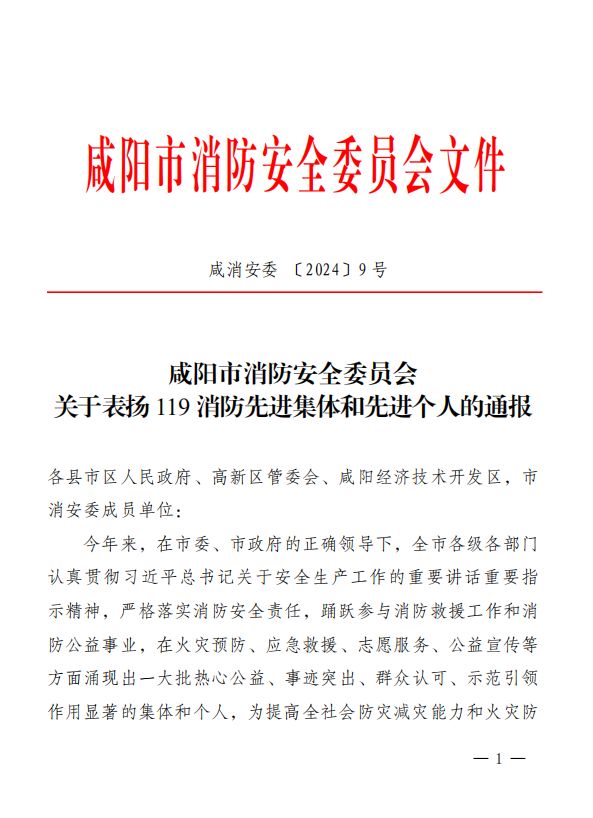 近期,為貫徹習(xí)近平總書記關(guān)于安全生產(chǎn)工作的重要講話重要指示精神,咸陽(yáng)市委市政府組織咸陽(yáng)市消防安全委員會(huì)對(duì)全市各機(jī)關(guān)、團(tuán)體、企事業(yè)單位的消防安全工作進(jìn)行綜合考核評(píng)比,對(duì)消防工作突出、成績(jī)優(yōu)異、群眾認(rèn)可、示范引領(lǐng)作用顯著的先進(jìn)集體和個(gè)人給予表彰。