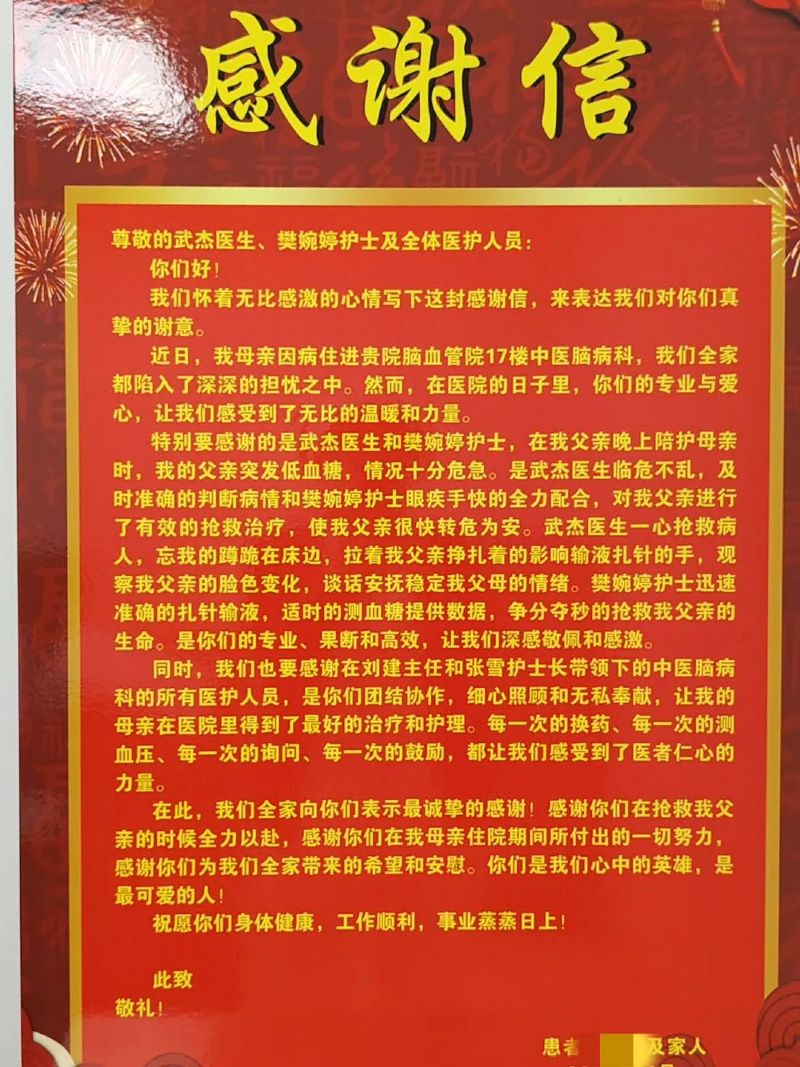 家屬們特別指出,患者的康復(fù)之路不僅得益于先進(jìn)的醫(yī)療設(shè)備,更歸功于醫(yī)護(hù)人員的專(zhuān)業(yè)精神和周到服務(wù)。樊護(hù)士在照料患者時(shí)總是面帶微笑,用溫和的語(yǔ)言耐心解答他們的問(wèn)題,給予了患者和家屬極大的心理支持。除了武杰醫(yī)生和樊婉婷護(hù)士,科室的其他醫(yī)護(hù)人員也在患者康復(fù)過(guò)程中展現(xiàn)了卓越的專(zhuān)業(yè)技能和優(yōu)質(zhì)的護(hù)理服務(wù),為患者的恢復(fù)提供了無(wú)微不至的關(guān)懷。
