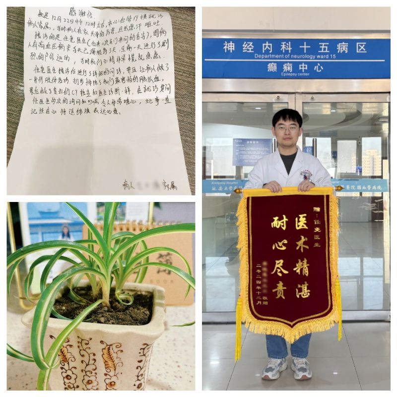 患者康復(fù)出院后,被任醫(yī)生的仁心仁術(shù)深深打動(dòng)。為了表達(dá)內(nèi)心的感激之情,12月31日早上特意送來(lái)一盆生機(jī)勃勃的綠植,寓意著生命的頑強(qiáng)與希望,也象征著任醫(yī)生給患者帶來(lái)的新生。同時(shí),患者還送上了一封飽含深情的感謝信和一面繡著“醫(yī)術(shù)精湛,耐心盡責(zé)”的錦旗。感謝信中的一字一句,都書(shū)寫(xiě)著患者在患病期間的無(wú)助與恐懼,以及任醫(yī)生的出現(xiàn)給予他們的勇氣和力量。錦旗上的燙金大字,閃耀著患者對(duì)任醫(yī)生醫(yī)術(shù)和醫(yī)德的高度贊譽(yù),這不僅僅是一份榮譽(yù),更是一份責(zé)任與擔(dān)當(dāng)?shù)南笳鳌?