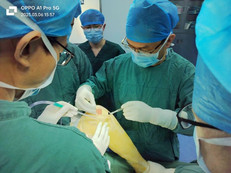 義診活動結(jié)束后,楊佩教授前往骨科三病區(qū)開展查房指導(dǎo)工作,并進行學(xué)術(shù)講座及疑難病例討論活動,為大家?guī)砹饲把氐脑\療技術(shù)和先進理念。隨后,他憑借其豐富的臨床經(jīng)驗和優(yōu)質(zhì)的醫(yī)療醫(yī)術(shù),給一位多年飽受膝關(guān)節(jié)疼痛的患者成功實施了復(fù)雜膝關(guān)節(jié)置換術(shù)。不僅展現(xiàn)了他在骨關(guān)節(jié)外科領(lǐng)域的專業(yè)水平,更為患者帶來了實實在在的健康福音。