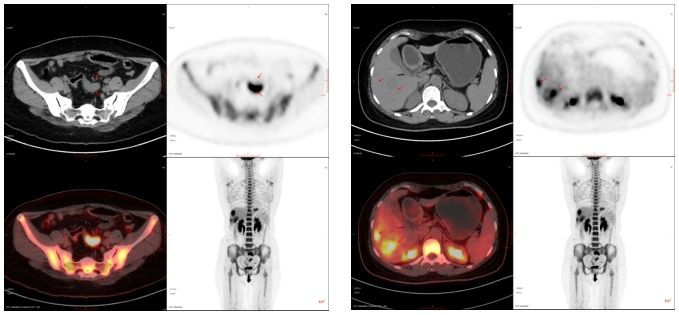 PET/CT診斷:乙狀結(jié)腸癌伴肝臟、淋巴結(jié)多發(fā)轉(zhuǎn)移;隨后病理確診為乙狀結(jié)腸腺癌。