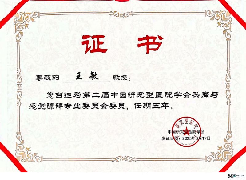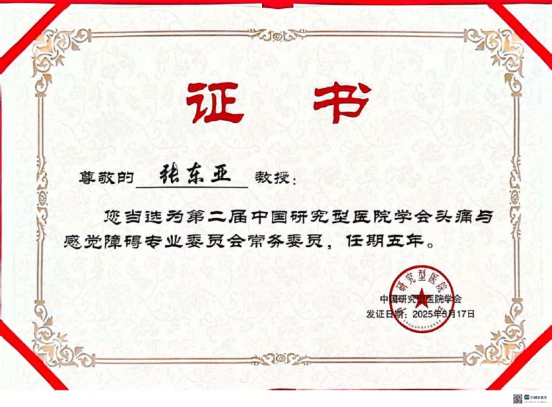 在近期召開的“2025中國頭痛大會”上,我院張東亞主任當選為中國研究型醫(yī)院學會頭痛與感覺障礙專業(yè)委員會常委,王敏主任當選為委員。兩位專家的任職標志著本院在頭痛領域的研究與臨床實踐獲得國家級認可。