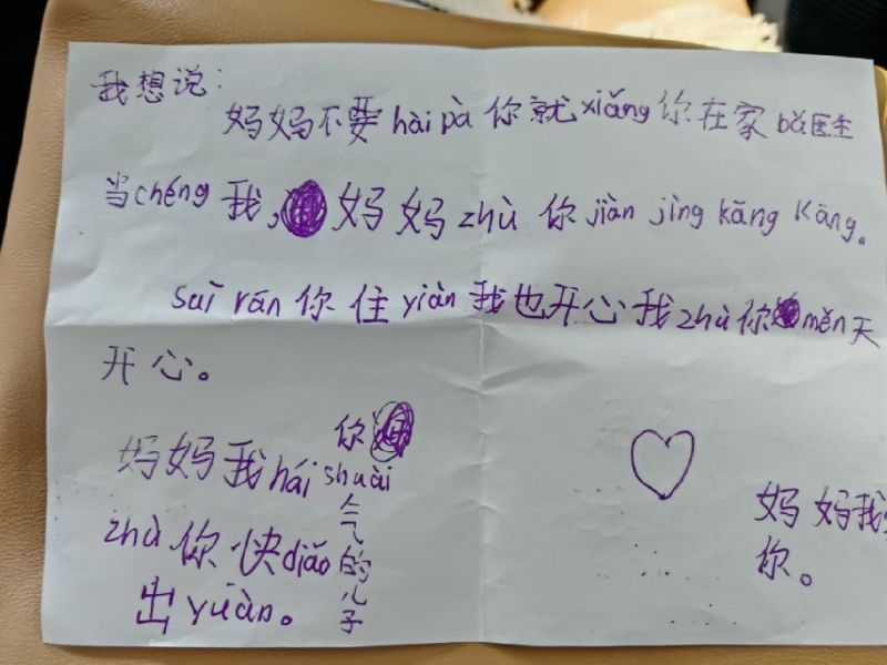 瑤瑤:“工作中我一直勤勤懇懇,認真負責,對待每位患者都熱情周到服務(wù),用真誠與熱情溫暖著每一位患者的心。面對行動不便的患者,會主動上前攙扶,遇到情緒焦慮的患者,會停下手中的工作,用專業(yè)知識和溫暖話語安撫化解患者的不安。經(jīng)常受到領(lǐng)導(dǎo)與家屬的好評。生活中由于工作原因沒有太多時間陪我兒子,但是我會讓兒子感到不管我在哪里都很愛他,我會經(jīng)常對他說媽媽愛你,出門的時候會抱抱他,他現(xiàn)在已經(jīng)7歲了,我還是會這樣做。小的時候只要有時間我都會給他講繪本故事,每次不管多累都會陪他干他想干的事,下夜班回家他都不會打擾我,真的是個很暖、很省心的孩子。還有就是家里人的支持,一個有愛的家庭氛圍也是很重要的。這次生病后讓我收獲家人滿滿的愛?!边@時她拿出手機讓我看孩子給她寫的信,讀著讀著瑤瑤突然趴到我的肩膀失聲痛哭起來。