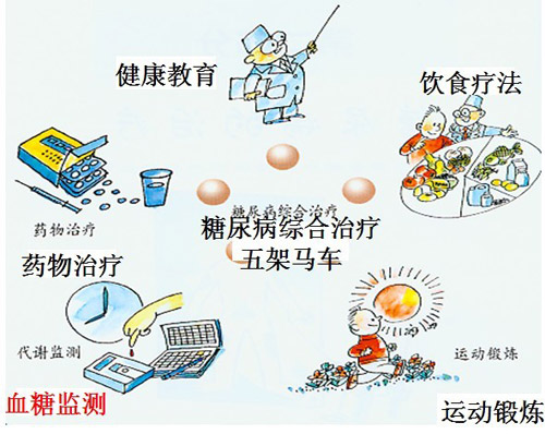 五駕馬車說(shuō)的是糖尿病的治療:第1駕馬車是 飲食治療:是每個(gè)糖尿病病人治療的基礎(chǔ)。第2駕馬車是運(yùn)動(dòng):輔助飲食治療,降低血糖,提高整體健康水平。第3駕馬車是降糖藥物:在飲食治療的基礎(chǔ)上,改善體內(nèi)糖代謝過(guò)程,力爭(zhēng)達(dá)到接近正常人的血糖水平,既保證人體能量所需,又利于達(dá)到各項(xiàng)控制指標(biāo)。第4和第5駕馬車是糖尿病教育和病人自我監(jiān)測(cè)血糖:是以上治療措施能否正確實(shí)施的保障。監(jiān)測(cè)血糖如同高血壓病人監(jiān)測(cè)血壓一樣重要,是判斷治療效果和調(diào)整治療方案最直接的證據(jù)。