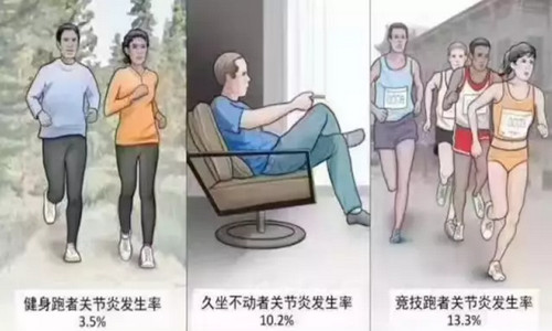 2017年美國《骨科與運(yùn)動物理治療雜志》(JOSPT)發(fā)表論文(Meta分析)指出,競技跑步者的關(guān)節(jié)炎發(fā)生率為13.3%,久坐不動人群的關(guān)節(jié)炎發(fā)生率為10.2%,而健身跑步者的關(guān)節(jié)炎發(fā)生率僅為3.5%。因此大數(shù)據(jù)顯示長時間的大宗隨訪研究結(jié)果是:過量和高強(qiáng)度的跑步可能會引發(fā)關(guān)節(jié)問題,但對于普通健身跑步的人來說,跑步是有利于關(guān)節(jié)健康的。