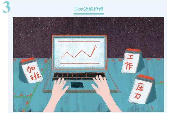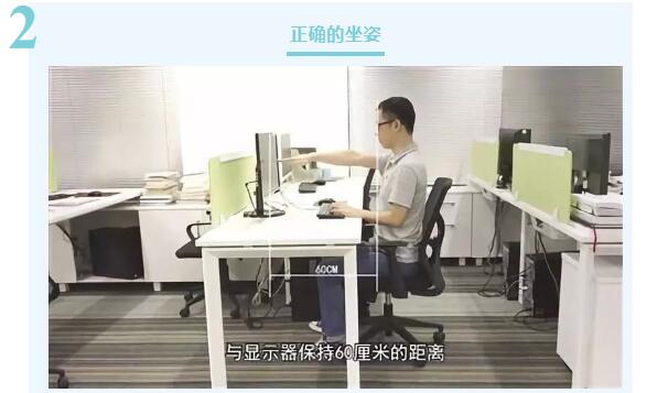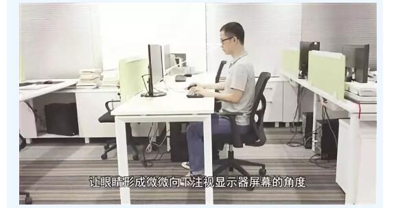 雙眼高度與顯示器上沿位置相當(dāng),與顯示器保持60厘米的距離,讓眼睛形成微微向下注視顯示器屏幕的角度,使頸部肌肉得到放松。計算機(jī)屏幕放置的位置和角度要合適,避免反射和眩光的影響。