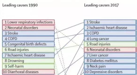 2017年中風(fēng)、缺血性心臟病和慢阻肺是國人死亡的前三位殺手,其次是肺癌、道路交通意外傷害、新生兒死亡、肝癌、糖尿病、頸部疼痛和抑郁障礙。