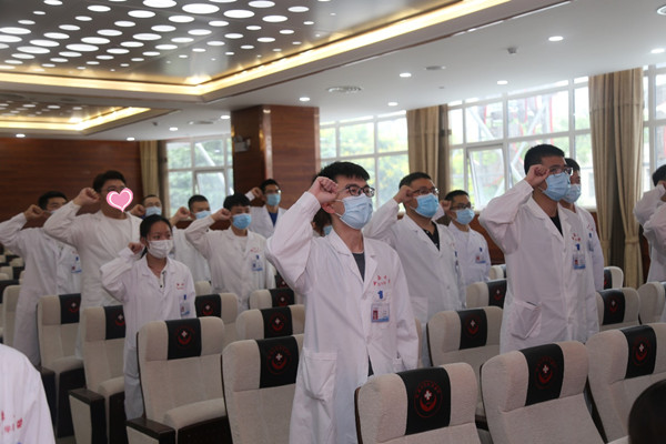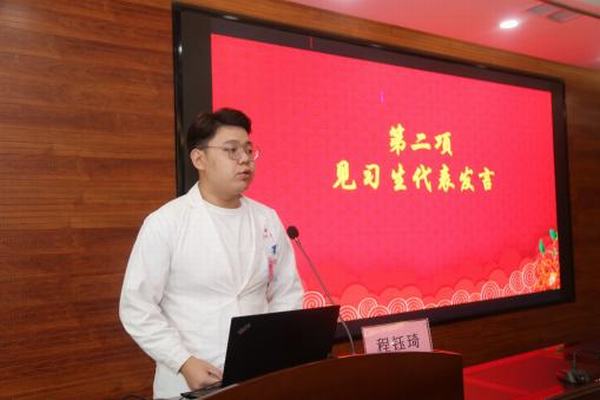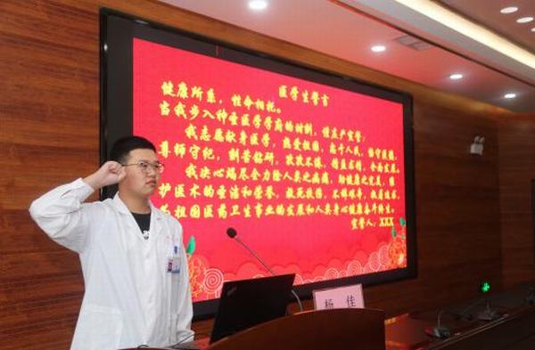 隨后,程鈺琦同學代表全體學生進行發(fā)言,他表示,在新的環(huán)境下要繼續(xù)發(fā)揚延安大學的艱苦奮斗精神,不斷加強自我修養(yǎng),提高品格,培養(yǎng)自主學習和獨立思考解決問題的能力,圓滿完成見習期間的各項任務,以優(yōu)異的成績回報醫(yī)院、學校和社會。接著,楊佳同學帶領全體見習生領誦《醫(yī)學生誓言》,所有見習生舉起右手莊嚴宣誓,立志為醫(yī)學事業(yè)奮斗終生。