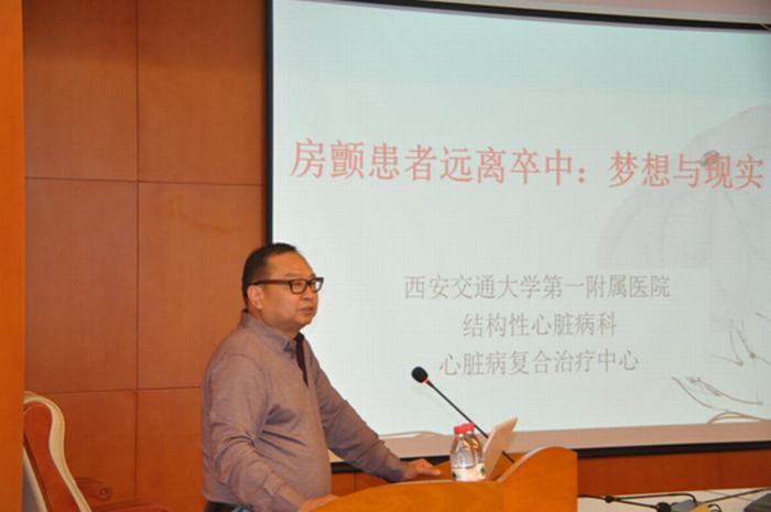 張玉順教授現(xiàn)為西安交通大學(xué)醫(yī)學(xué)院第一附屬醫(yī)院心血管病醫(yī)院副院長,周圍血管病科主任醫(yī)師、博士,中國老年保健醫(yī)學(xué)研究會心臟學(xué)會副主任委員、中國醫(yī)藥信息學(xué)會心功能學(xué)會副主任委員,亞太心臟聯(lián)盟結(jié)構(gòu)性心臟病分會副主任委員兼秘書長,結(jié)構(gòu)性心臟病工作委員會副主任委員等,在結(jié)構(gòu)性心臟病的介入治療、暈厥、偏頭痛、不明原因腦卒中等心腦血管疾病及肺動脈高壓等的研究方面處于世界領(lǐng)先水平。張教授以《讓房顫患者遠離卒中》為題,旁征博引、圖文并茂,向與會者闡述了如何提高心血管病診療能力的方法,通過大量的臨床實例進行深入分析,使醫(yī)務(wù)人員對如何提高臨床能力有了較為全面的認識和了解,為我院心血管病院的臨床工作指明了發(fā)展的方向。張教授通俗易懂、生動有趣的授課,引起了大家的共鳴,贏得了現(xiàn)場陣陣熱烈的掌聲。