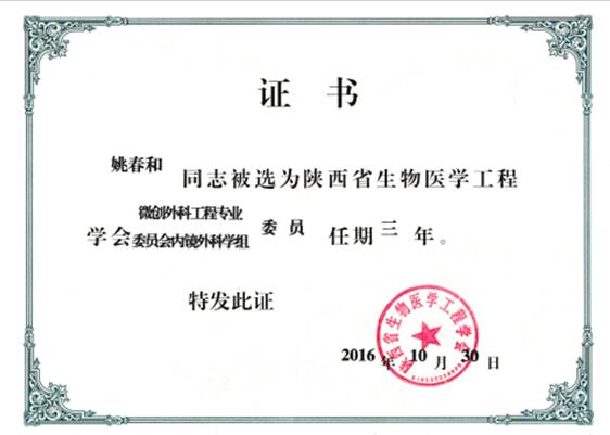 近日,從陜西省生物醫(yī)學(xué)工程學(xué)會傳來喜訊,我院普通外科姚春和主任成功當(dāng)選為陜西省生物醫(yī)學(xué)工程學(xué)會微創(chuàng)外科工程專業(yè)委員會內(nèi)鏡外科學(xué)組委員!