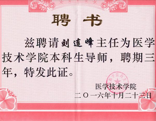 近日,從陜西中醫(yī)藥大學(xué)醫(yī)學(xué)技術(shù)學(xué)院傳來(lái)喜訊,我院醫(yī)學(xué)影像科主任劉連鋒副教授成功獲聘為陜西中醫(yī)藥大學(xué)醫(yī)學(xué)技術(shù)學(xué)院本科生導(dǎo)師。