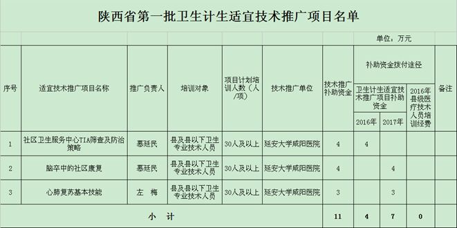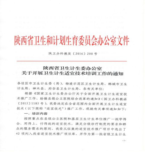 2016年12月5日,根據(jù)《陜西省衛(wèi)生計(jì)生委辦公室關(guān)于開(kāi)展衛(wèi)生計(jì)生適宜技術(shù)培訓(xùn)工作的通知》(陜衛(wèi)辦科教發(fā)【2016】200號(hào))文件精神,我院慕廷民副院長(zhǎng)領(lǐng)銜申報(bào)的項(xiàng)目《社區(qū)衛(wèi)生服務(wù)中心TIA篩查及防治策略》、《腦卒中的社區(qū)康復(fù)》和心血管內(nèi)科二病區(qū)左梅主任領(lǐng)銜申報(bào)的項(xiàng)目《心肺復(fù)蘇基本技能》經(jīng)陜西省衛(wèi)計(jì)委審核評(píng)定,分別獲批為陜西省第一批衛(wèi)生計(jì)生適宜技術(shù)推廣項(xiàng)目,獲批經(jīng)費(fèi)總計(jì)達(dá)11萬(wàn)。本次全省共選出42個(gè)項(xiàng)目列入陜西省適宜技術(shù)推廣項(xiàng)目庫(kù)。