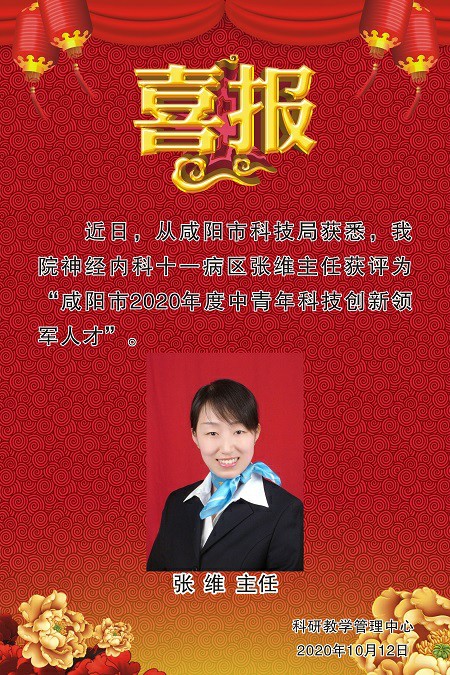 近日,從咸陽市科技局獲悉,我院神經(jīng)內(nèi)科十一病區(qū)張維主任榮膺“咸陽市2020年度中青年科技創(chuàng)新領(lǐng)軍人才” 稱號!