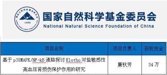 近日,國家自然科學(xué)基金委員會(huì)公布了2021年度國家自然科學(xué)基金項(xiàng)目評(píng)審結(jié)果,我院心血管內(nèi)科八病區(qū)廉秋芳博士領(lǐng)銜申報(bào)的項(xiàng)目“基于p38MAPK/NF-kB通路探討Klotho對(duì)鹽敏感性高血壓腎損傷保護(hù)作用的研究(批準(zhǔn)編號(hào):82160090)”順利獲批,獲批資助金額34萬元。