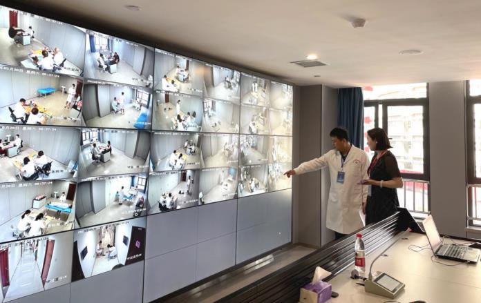 院領導韓曉芳與總考官李鵬在中控室實時監(jiān)控