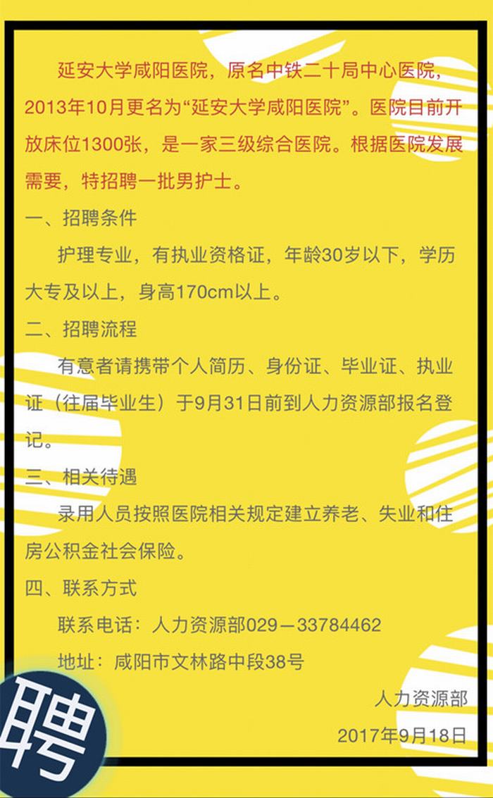 延安大學咸陽醫(yī)院男護士招聘啟示