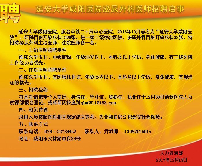 延安大學(xué)咸陽(yáng)醫(yī)院泌尿外科醫(yī)師招聘啟事